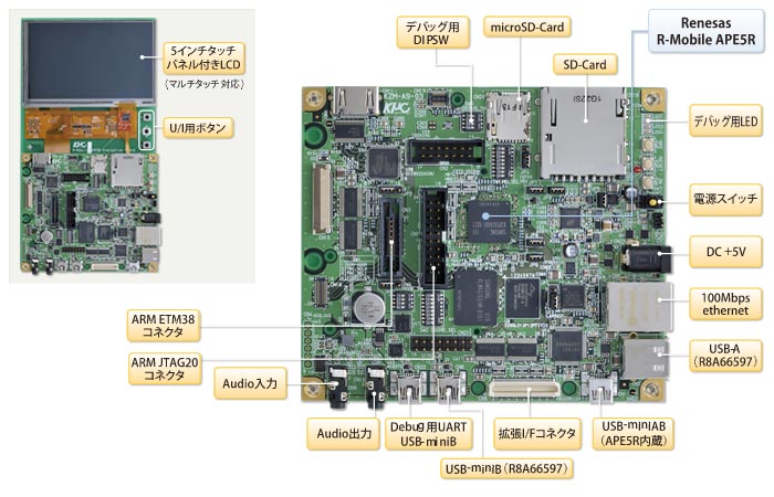 ルネサスエレクトロニクス社のR-Mobile APE5Rを搭載した評価ボードです。