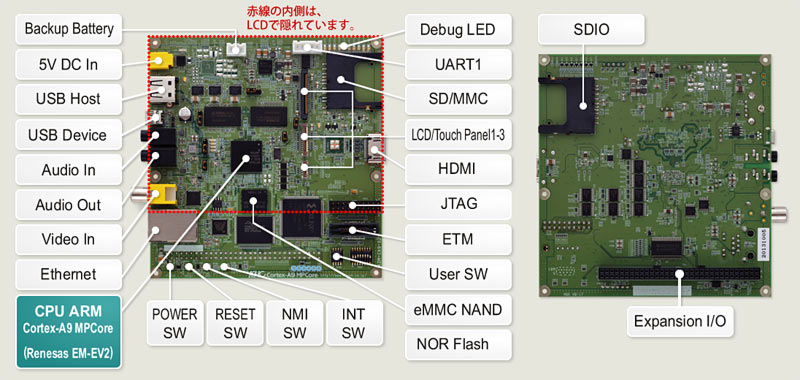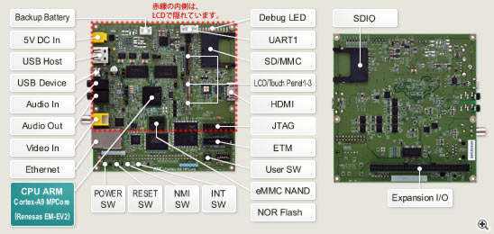 | ペリフェラル | USB2.0 / 100M,10M Ethernet / SD MMCスロット (SDHC対応) / SD IOスロット / LCD and Touch Panel (800 x 480) / HDMI出力 / Camera入力 (コンポジットコネクタ) / Audio入出力 / UART / 拡張コネクタ (16bit bus,I2C etc…) |