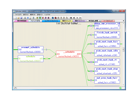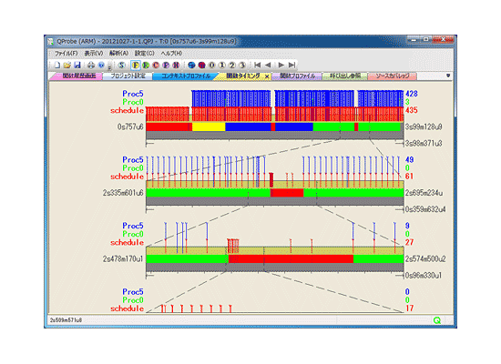 AUDトレースやETMトレースなど、CPUの実行命令履歴から、ソフトウェアの各種の動作状況を表示する、動的解析ツールです。ソフトウェア全体を解析したり、また、タスクやプロセス・スレッドなどのコンテキスト別に解析することが可能です。