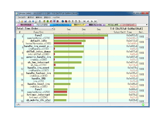 関数ごとの実行時間、実ステップ数などの情報をグラフィカルに表示することにより、実行スピードに対するボトルネックとなっている関数の特定を容易にします。